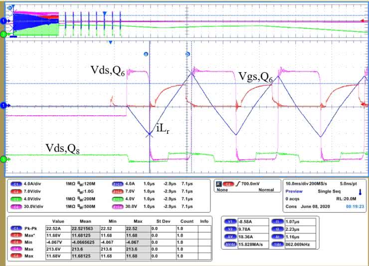 Pierwszym blokiem zasilacza jest bezmostkowy konwerter totemowy AC-DC i dopiero za nim znajduje się właściwy półmostkowy konwerter LLC-DC. Przedni konwerter zapewnia korekcję współczynnika mocy (PFC) i redukcję zniekształceń harmonicznych (THD). Przetwornica LLC zapewnia bezpieczną izolację strony wtórnej oraz ściśle regulowane napięcie wyjściowe.