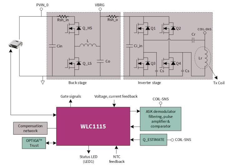 Płytka współpracuje z odbiornikami bezprzewodowymi z certyfikatem WPC. Stopień wejściowy układu zasilania to regulator w topologii buck z dwoma kluczami, który służy do zapewnienia regulowanego napięcia do falownika pełnomostkowego, napędzającego obwód rezonansowy (kondensator rezonansowy i cewka nadajnika). Jako kontroler zastosowano układ typu WLC1115, który może obsługiwać sterowanie ze zmiennym napięciem wejściowym falownika i zmienne częstotliwości robocze WPC. WLC1115 ma zintegrowane sterowniki bramek dla kluczy regulatora oraz falownika i oferuje wiele programowalnych funkcji do tworzenia odrębnych rozwiązań nadajników bezprzewodowych. Infineon oferuje rozwiązanie referencyjne z certyfikatem Qi v1.3.2 EPP z kilkoma konfigurowalnymi parametrami za pomocą narzędzia konfiguracji.
