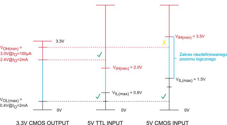 Na rysunku 1 pokazano przykład połączenia wyjścia układu cyfrowego zasilanego napięciem +3,3 V z wejściami układów cyfrowych wykonanych w technologii TTL (bipolarnej) i technologii CMOS. Oprócz różnicy napięć istotna jest też technologia wykonania układów.
