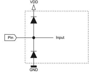 Jeszcze większe problemy pojawiają się, kiedy wyjście układu zasilanego napięciem +5 V łączymy z wejściem układu zasilanego napięciem +3,3 V. Każde z wejść CMOS jest zabezpieczone parą diod spolaryzowanych zaporowo, tak jak pokazano na rysunku 2. Pojawienie się na wejściu napięcia wyższego niż napięcie zasilania VCC +0,7 V powoduje spolaryzowanie górnej diody i zaczyna przez nią płynąć prąd. Przy większej wydajności prądowej wyjścia może to spowodować uszkodzenie zarówno wyjścia, jak i diody zabezpieczającej wejście. Część układów mikrokontrolerów zasilanych napięciem +3,3 V ma wejścia akceptujące poziomy napięć do 5 V (+5 V tolerant), ale nie jest to normą.