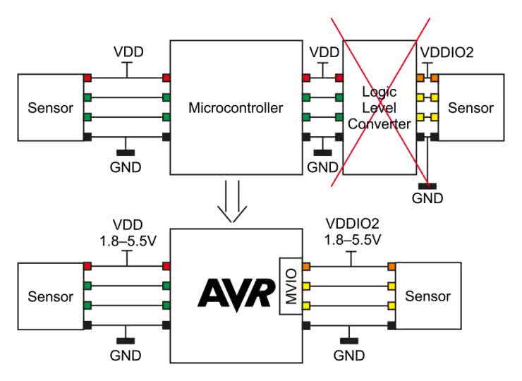 Równie dobrym rozwiązaniem jest zastosowanie mikrokontrolerów AVR DB wyposażonych w konfigurowalny zintegrowany konwerter/przesuwnik poziomu napięć logicznych. Funkcja wielonapięciowych wejść/wyjść (MVIO) umożliwia zasilanie podzbioru wyprowadzeń portów I/O przez napięcie VDDIO2. Poziomy logiczne wyjść i wejść MVIO są odnoszone do tego napięcia VDDIO2, a nie do napięcia zasilania VDD. Dla wejść napięcie stanu niskiego VIL będzie miało wartość nie większą niż 0,2 VDDIO2 (bufor Schmitta) lub nie większą niż 0,3 VDDIO2 dla magistrali I²C. Napięcie stanu wysokiego VIH jest nie mniejsze niż 0,8 VDDIO2 (bufor Schmitta) lub nie mniejsze niż 0,7 VDDIO2 (magistrala I²C). W przypadku wyjść napięcie stanu niskiego VOL jest nie większe niż 0,6 V, a napięcie stanu wysokiego nie mniejsze niż VDDIO2 – 0,7 V. Mikrokontroler i wyprowadzenia nieobjęte działaniem MVIO są zasilane napięciem VDD. VDD i VDDIO2 są niezależne od siebie, ale oba muszą się mieścić w tym samym dopuszczalnym zakresie od +1,8 V do +5,5 V. Idea tego rozwiązania została pokazana na rysunku 3.