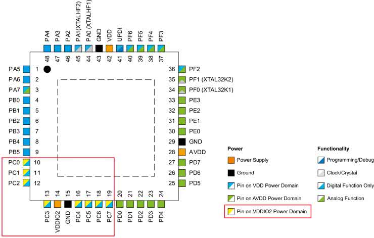 Obecnie wyprowadzenia z funkcją MVIO są zgrupowane w porcie PORTC zasilanym przez wyprowadzenie VDDIO2 (rysunek 4). Mogą mieć tylko funkcję cyfrowych linii I/O (nie mogą być wejściami analogowymi). Wyprowadzenia z funkcją MVIO zachowują się tak samo jak zwykłe cyfrowe wyprowadzenia I/O. Mogą być uniwersalnymi liniami GPIO, liniami magistral szeregowych, w tym również dwukierunkowych (USART, SPI, I²C) oraz wyjściami PWM.