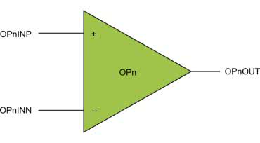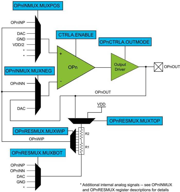 Multiplekser na wejściu nieodwracającym (+) każdego wzmacniacza operacyjnego umożliwia podłączenie do zewnętrznego wyprowadzenia mikrokontrolera, przełącznika pozycji „suwaka” drabinki rezystorowej, wyjścia przetwornika cyfrowo-analogowego DAC, masy (GND), napięcia VDD/2 lub wyjścia z innego wzmacniacza operacyjnego. Drugi multiplekser na wejściu odwracającym (–) każdego wzmacniacza operacyjnego umożliwia podłączenie do zewnętrznego wyprowadzenia mikrokontrolera, przełącznika pozycji „suwaka” drabinki rezystorowej, wyjścia wzmacniacza operacyjnego lub wyjścia DAC.