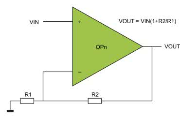 Wzmacniacz nieodwracający (rysunek 9) nie zmienia fazy sygnału wzmacnianego. Wzmocnienie zależy od wartości rezystorów R1 i R2 i jest wyliczane według zależności: