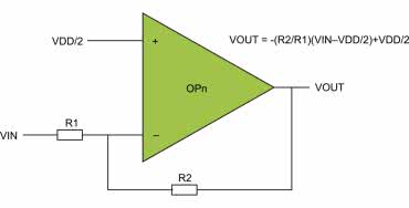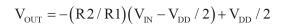 Tutaj zdecydowano się do sygnału wyjściowego dodać składową stałą o wartości VDD/2 po to, aby możliwe było wzmacnianie sygnałów symetrycznych względem masy. Sygnał wyjściowy wyliczany jest z zależności: