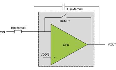 W tej konfiguracji oba wejścia: odwracające (–) i nieodwracające (+) oraz wyjście wzmacniacza są podłączone do wyprowadzeń mikrokontrolera (rysunek 7). Jest to przydatna konfiguracja, w której użytkownik chce wykonać wszystkie połączenia z elementami wzmacniacza na zewnątrz mikrokontrolera, na przykład w układach filtrów, kiedy potrzebne są precyzyjne rezystory o ściśle określonych wartościach i kondensatory.