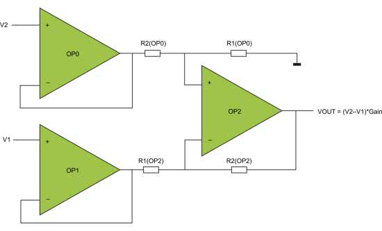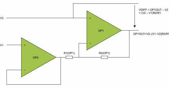 Za pomocą dwu wzmacniaczy można skonfigurować wzmacniacz wzmacniający sygnał różnicowy sygnałów podawanych na wejścia nieodwracające (rysunek 12). Wzmocnienie określają rezystory R1 i R1 z układu wzmacniacza OP1.