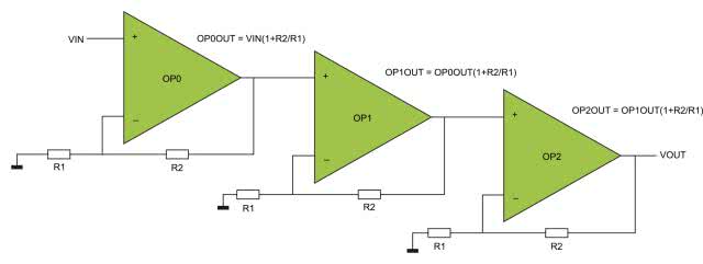 Wzmacniacze kaskadowe stosuje się w celu uzyskania dużego wzmocnienia. Są zbudowane z identycznych stopni połączonych szeregowo. W naszym przypadku można skonfigurować wzmacniacze odwracające lub nieodwracające zbudowane z dwu lub trzech stopni. Przykładowa konfiguracja trzystopniowego wzmacniacza kaskadowego nieodwracającego została pokazana na rysunku 13.