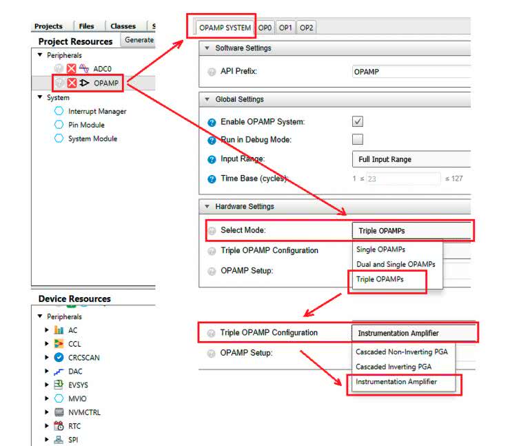 Konfigurację rozpoczynamy od wybrania modułu OPAMP z listy urządzeń Device Resources. Wybrany moduł pojawi się w liście Project Resources. Okno konfigurowania modułu OPAMP ma cztery zakładki: OPAMP SYSTEM, OP0, OP1 i OP2. W zakładce OPAMP SYSTEM ustawiamy: