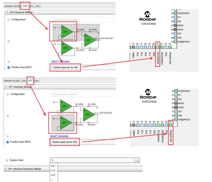 Cała procedura jest powtarzana dla drugiego wejścia pomiarowego. Mierzone napięcie V1 jest podawane na wejście nieodwracające wzmacniacza operacyjnego OP1. W oknie Posistive Input MUX wybieramy Positive input for OPn, a konfigurator konfiguruje linię PD4 portu PORTD jako drugie wejście analogowe różnicowego wzmacniacza pomiarowego.