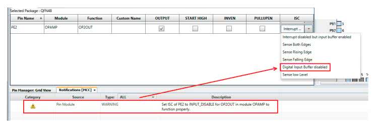 Ostatnia czynnością jest określenie wzmocnienia wzmacniacza w oknie System Gain. Po takim skonfigurowaniu pojawiają się ostrzeżenia o nie do końca dobrze skonfigurowanych wyjściach wzmacniacza połączonych z wyprowadzeniami mikrokontrolera. Żeby wszystko poprawnie działało, trzeba w oknie Pin Module konfiguratora MCC zablokować wejściowy bufor dla sygnałów cyfrowych, tak jak to zostało pokazane na rysunku 18.