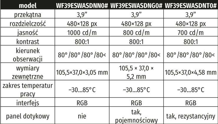 Wyświetlacze typu WF39ESWASDNN0#, WF39ESWASDNG0# i WF39ESWASDNT0# to 3,9-calowe ekrany LCD-TFT o rozdzielczości 480×128 px.