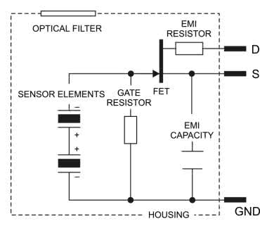 Na rynku dostępne są różne odmiany detektorów piroelektrycznych, różniące się szczegółami konstrukcyjnymi i - co za tym idzie - zakresem docelowych zastosowań. Czujniki dwuelementowe (rysunek 2) zawierają wprawdzie w swojej obudowie dwa kryształy piroelektryczne, ale… włączone są one szeregowo (przeciwsobnie) i obsługiwane przez pojedynczy tranzystor FET. Takie rozwiązanie służy do kompensacji zmian temperatury otoczenia oraz sygnału współbieżnego - przy dobrym dopasowaniu parametrów obu elementów zmiany intensywności promieniowania, rejestrowanego przez poszczególne kanały, są skutecznie tłumione (na zasadzie prostego odejmowania ładunków), co sprawia, że wysokiej jakości czujnik ruchu nie będzie reagował np. na szybkie nagrzewanie kaloryfera, umieszczonego w monitorowanym pomieszczeniu. Pojawienie się obiektu o temperaturze odbiegającej od temperatury tła, np. wejście człowieka do strefy detekcji, powoduje powstanie niezrównoważonego sygnału na wyjściu detektora, który jest następnie wzmacniany przez wbudowany tranzystor i - dalej - przetwarzany przez tor analogowy urządzenia.