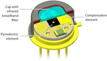 Kolejną obszerną grupą elementów pracujących w pasmie podczerwieni są czujniki PIR (ang. Passive InfraRed). Ich działanie opiera się na efekcie piroelektrycznym, który można wyobrazić sobie jako termiczny analog efektu piezoelektrycznego - w tym przypadku bowiem sygnał elektryczny powstaje w wyniku zmian temperatury materiału (zwykle odpowiedniego kryształu). Nie jest zatem konieczne istnienie gradientu temperatury (co ma miejsce w przypadku zjawiska Seebecka, wykorzystywanego w termoparach), ważne jest jedynie, by temperatura zmieniała się w czasie. Z tego też względu czujniki piroelektryczne nie nadają się do pomiaru temperatury czy też np. detekcji statycznej obecności obiektów (np. ludzi) w monitorowanych przestrzeniach, doskonale sprawdzają się natomiast w czujnikach ruchu, stosowanych w systemach alarmowych (fotografia 5).