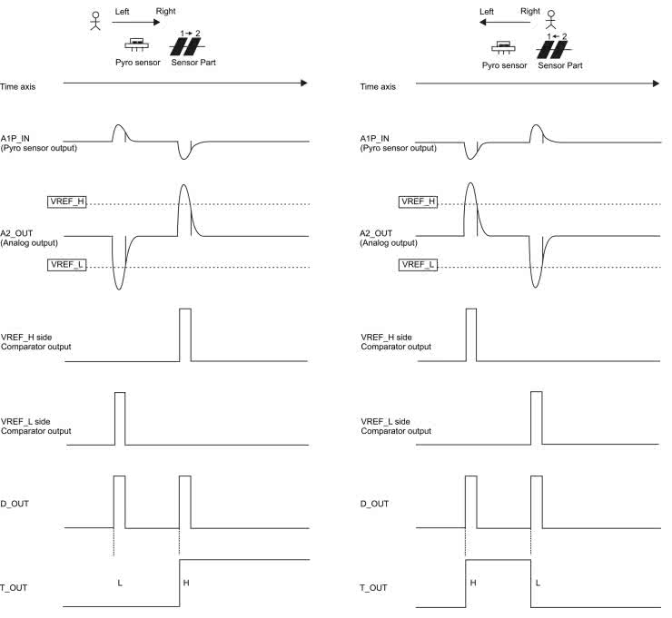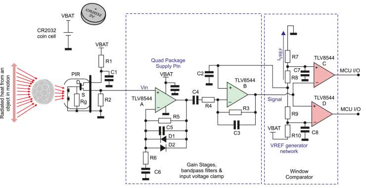 Przy zastosowaniu prostszych czujników piroelektrycznych (tj. bez wewnętrznej elektroniki przetwarzającej sygnał z piroelementów), projektanci mają do wyboru zasadniczo dwie ścieżki. Podejście klasyczne opiera się na zastosowaniu wielostopniowego wzmacniacza i układów filtrujących, sprzężonych bezpośrednio z przetwornikiem ADC bądź też - poprzez komparatory - ze zwykłymi liniami I/O mikrokontrolera (w najprostszych urządzeniach, np. budżetowych wyłącznikach zmierzchowych z funkcją detekcji ruchu, można rzecz jasna wykorzystać mniej zaawansowane obwody analogowo-cyfrowe do sterowania przekaźnikiem wyjściowym).