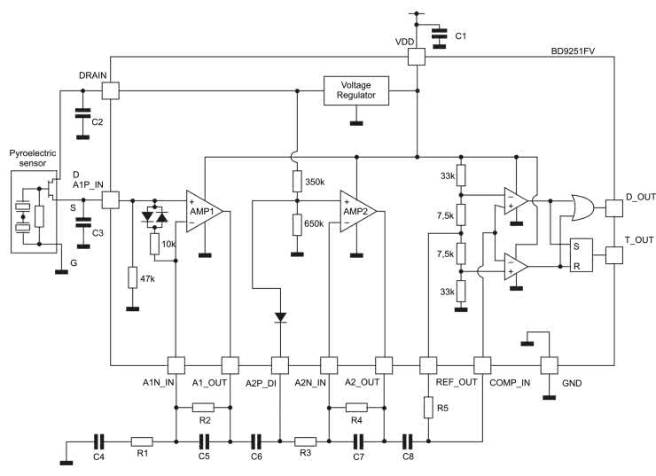 Warto dodać, że powstają także specjalne układy scalone, przeznaczone do pracy z czujnikami PIR i pełniące funkcję kompletnych front-endów analogowych. Układ BD9251FV marki Rohm Semiconductor ma wszystkie bloki, niezbędne do budowy detektora ruchu na bazie sensora piroelektrycznego - oprócz dwustopniowego wzmacniacza oraz komparatora okienkowego z obwodami biasu, twórcy układu przewidzieli także wewnętrzny stabilizator napięcia oraz prostą logikę wyjściową (bramkę OR oraz przerzutnik RS), umożliwiające bezpośrednie sprzężenie z wejściami procesora (rysunki 10 i 11).
