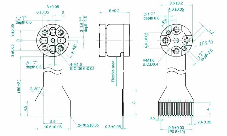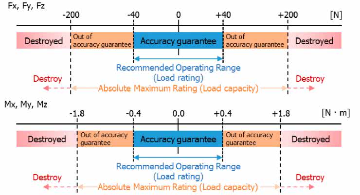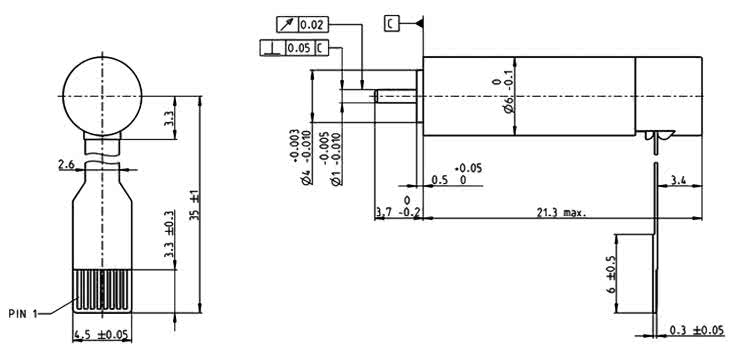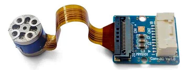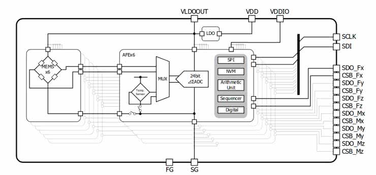 Sensor MMS101 ma wbudowany front-end analogowy, realizujący odczyt i kondycjonowanie sygnałów płynących z sześcioosiowej struktury MEMS, współpracującej z elementem ruchomym, umieszczonym w solidnej, metalowej obudowie. Czujnik jest przeznaczony do pracy w zakresie sił do ±40 N i momentów do ±0,4 Nm, choć może przetrwać przeciążenia, odpowiednio, do ±200 N i ±1,8 Nm. Co ważne, poziom szumu wynosi zaledwie 0,06 N (RMS)/0,0008 Nm (RMS), dzięki czemu komponent doskonale nadaje się do detekcji delikatnych nacisków, wywieranych przez narzędzie chirurgiczne na tkanki miękkie. Schemat blokowy sensora marki Mitsumi można zobaczyć na rysunku 4, zaś wymiary – na rysunku 5.