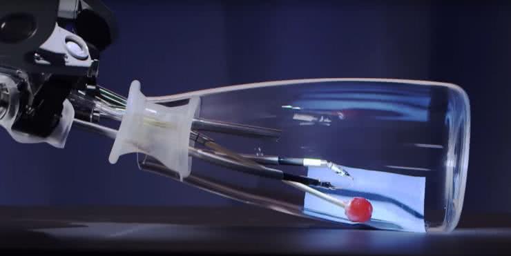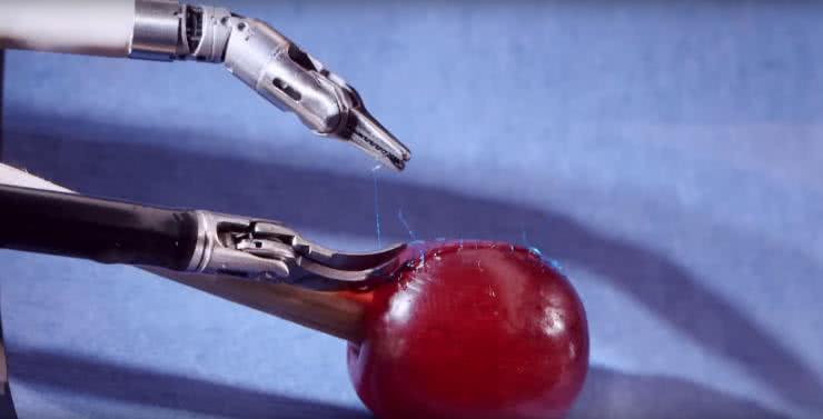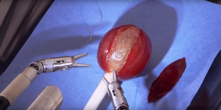 Wzrost liczby stopni swobody w „nadgarstkach” robotycznych narzędzi nie tylko znacząco zwiększa możliwości operowania w ciasnych przestrzeniach anatomicznych, ale także znacznie poprawia dynamikę sterowania i redukuje ryzyko kolizji pomiędzy sąsiadującymi ramionami robota. Płynnie sterowane silniki o konstrukcji redukującej efekt coggingu pozwalają natomiast na uzyskanie niemal idealnie płynnego ruchu, który wprawdzie naśladuje kształt trajektorii manetek, obsługiwanych przez chirurga, ale w trakcie przetwarzania cyfrowego zostaje „wygładzony”, co w fachowej nomenklaturze określa się mianem redukcji tremoru (in. drżenia). W ten sposób na tkanki pacjenta przenoszony jest jedynie zamierzony przez chirurga ruch, związany z wykonywaną aktualnie czynnością – np. szyciem naczyń krwionośnych. Fascynującym przykładem możliwości współczesnych robotów chirurgicznych jest „operacja” winogrona, w ramach której doświadczony operator przyszył z powrotem na właściwe miejsce oddarty wcześniej pasek skórki owocu, co ciekawe – umieszczonego w podłużnym, szklanym naczyniu z wąską szyjką (fotografie 14…16). Ten niezwykle interesujący „zabieg” to demonstracja możliwości robota, bazująca na umiejętnym zastosowaniu technologii dostępu chirurgicznego z jednej strony (da Vinci Surgery Single-Site Technology).