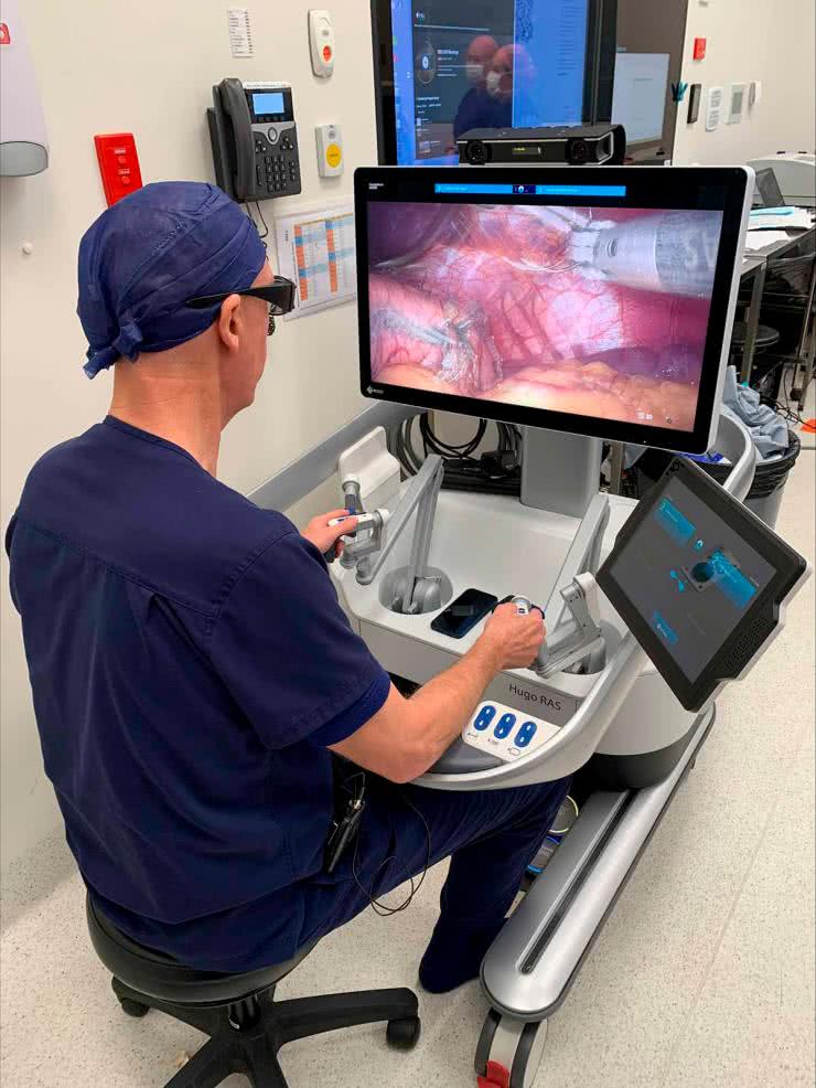 Nic nie stoi jednak na przeszkodzie, by do prezentowania stereoskopowego obrazu zastosować wysokiej klasy monitor, współpracujący z okularami 3D zakładanymi przez operatora. Na taką technologię zdecydował się inny potentat na rynku aparatury medycznej – firma Medtronic. Konsola robota HUGO RAS (fotografie 19 i 20) sprawia wrażenie niebywałej lekkości, pozwala też chirurgowi pozostawać w ciągłym kontakcie głosowym, a nawet wzrokowym zresztą zespołu operacyjnego – pozycja operatora nie różni się zasadniczo od tej, przyjmowanej podczas pracy przy zwykłym komputerze (z tą drobna różnicą, że praca wymaga w tym przypadku założenia okularów polaryzacyjnych).