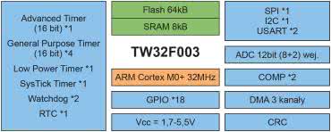 Płytka TWen32F003 jest jednym z wielu modułów opracowanych na potrzeby projektów z internetowej platformy edukacyjno-szkoleniowej http://haohaodada.com. Platforma ta koncepcyjnie zbliżona jest do znanego wśród programistów mikrokontrolerów ARM środowiska Mbed Online Compiler (obecnie już nie rozwijanego i zastąpionego przez Keil Studio Cloud). Programy pisze się tu w oknie przeglądarki www, kompiluje w chmurze, a program wynikowy jest następnie przesyłany do płytki użytkownika w celu wykonania. Platforma http://haohaodada.com obsługuje wiele różnych dalekowschodnich mikrokontrolerów, zarówno 8- jak i 32-bitowych, do których oferuje specjalne płytki uruchomieniowe. O ile zazwyczaj zainstalowane w nich mikrokontrolery są dość dobrze udokumentowane, o tyle w przypadku płytki TWen32F003 większość dostawców ogranicza się do stwierdzenia, że użyty w niej mikrokontroler jest wyposażony w 32-bitowy rdzeń ARM, nie określając nawet dokładnego typu rdzenia. Poszukiwania producenta TW32F003 w Internecie również nie przynoszą żadnych rezultatów. Można jedynie natrafić na schemat blokowy tego układu, obrazujący zaimplementowane w mikrokontrolerze peryferia. Schemat ten widnieje na rysunku 1.