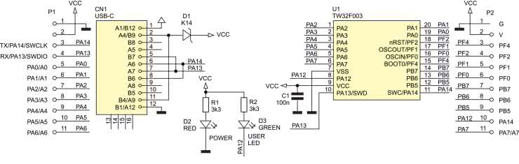 Zgodnie z aktualnym trendem płytka jest wyposażona w złącze standardu USB C. Pewne zdziwienie może budzić fakt podłączenia portów PA13 i PA14 mikrokontrolera do linii danych DN i DP w gnieździe USB, ponieważ mikrokontroler TW32F003 nie ma wbudowanego interfejsu USB. Jak jednak wynika z diagramu na stronie platformy szkoleniowej, płytki uruchomieniowe nie są podłączane bezpośrednio do portu USB komputera PC, lecz do gniazda USB w programatorze – debuggerze typu STC Link. Kabel USB C łączący płytkę uruchomieniową z programatorem – debuggerem zastępuje w tym przypadku zwykły przewód taśmowy interfejsów SWD i RS. Drugą opcją jest podłączenie płytki TWen32F003 do komputera PC za pośrednictwem modułu LILYGO T-U2T. Jest to – wykonany w formie „pendriva”, zakończonego z obu stron gniazdami USB C – konwerter USB/UART-TTL. Używa się go w płytkach systemu LILYGO. Bezpośrednie podłączenie płytki uruchomieniowej TWen32F003 do portu USB w komputerze PC pozwala jedynie na jej zasilanie – układ nie jest wykrywany przez system operacyjny MS Windows jako urządzenie peryferyjne.