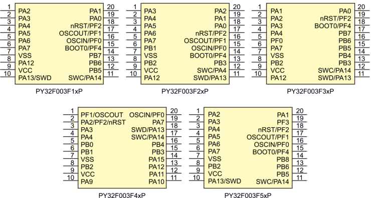Mikrokontrolery PY32F0 można nabyć w wielu typach obudów, poczynając od najmniejszych z 8 wyprowadzeniami, aż do największych o 32 wyprowadzeniach. Są to standardowe obudowy typu SOP, MSOP, TSSOP, DFN, QFN i LQFP. Pojawiła się też jedna nietypowa obudowa ESSOP10 – o 10 wyprowadzeniach w rastrze 1 mm. Kolejną rzadko spotykaną cechą tych układów okazuje się fakt, iż mikrokontroler w ramach danej obudowy jest oferowany z różnymi wariantami układu wyprowadzeń. Przykładowe zestawienie dostępnych odmian mikrokontrolera typu PY32F003 w obudowie TSSOP20 pokazuje rysunek 4.