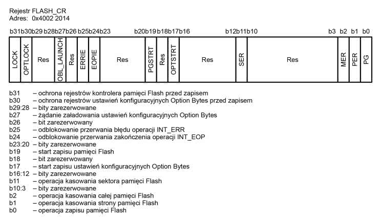 Zapis pamięci jest wykonywany tylko słowami o rozmiarze 32 bitów. Polega on na ustawieniu bitu operacji PG w rejestrze kontrolnym FLASH_CR, następnie zapisie pod kolejnymi adresami na programowanej stronie pamięci Flash 31 słów danych, każde o rozmiarze 32 bitów, inicjalizacji operacji zapisu przez ustawienie bitu PGSTART w rejestrze kontrolnym FLASH_CR i zapisie ostatniego 32-bitowego słowa danych pod końcowy adres na programowanej stronie. Wysłanie trzydziestego drugiego 32-bitowego słowa uruchamia zapis strony pamięci Flash. Zakończenie procesu jest sygnalizowane przez bit końca operacji (EOP) w rejestrze stanu FLASH_SR. W przypadku, gdy zapis strony się nie powiódł, bit ten pozostaje wyzerowany. Jeżeli błąd zapisu jest spowodowany ustawionym zabezpieczeniem sektora pamięci Flash przed zapisem, w rejestrze stanu dodatkowo ustawiony zostaje bit WRPERR. Uproszczony kod funkcji zapisu pamięci Flash opisuje listing 4.