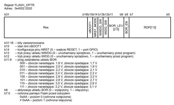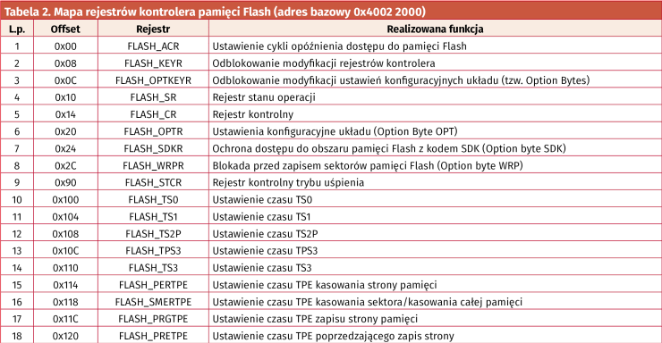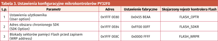 Parametry te przechowuje się na odpowiedniej stronie systemowej pamięci Flash w postaci trzech 32-bitowych słów, przy czym poszczególne ustawienia są przypisane do bitów b15...b0 w danym słowie, natomiast bity b31..b16 pełnią rolę kontroli błędów. W nieuszkodzonym słowie są one równe zanegowanym wartościom bitów b15...b0. Przy starcie mikrokontrolera bity b15...b0 są kopiowane do specjalnych rejestrów kontrolera pamięci Flash, odpowiednio FLASH_OPTR, FLASH_SDKR i FLASH_WRPR. Tabela 3 zawiera zestawienie adresów słów konfiguracyjnych w systemowej pamięci Flash oraz odpowiadających im rejestrów kontrolera pamięci Flash.