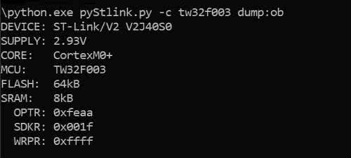 Odczyt ustawień konfiguracyjnych układu ogranicza się do pobrania zawartości rejestrów kontrolera pamięci Flash (zawierających kopie danych konfiguracyjnych) – i ich wyświetlenia. Funkcja ta w programie pyStlink została podpięta pod parametr wywołania programu: