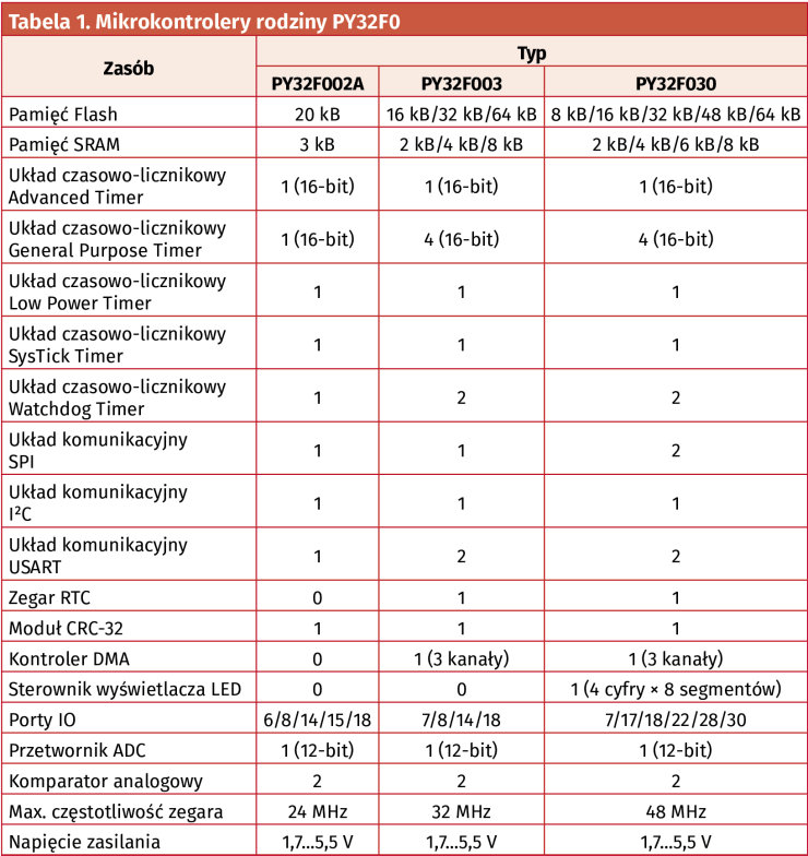 Mikrokontrolery firmy Puya są dość znane. Zdobyły one rozgłos jako najtańsze na rynku procesory z rdzeniem ARM, dostępne w cenie już od 8 centów za sztukę [1]. Rodzina układów PY32F0 obejmuje trzy modele: PY32F002A, PY32F003 oraz PY32F030, przy czym układ typu PY32F002 okazuje się najprostszy spośród nich. Jest on oferowany tylko z jedną opcją rozmiaru pamięci Flash i SRAM, obniżoną częstotliwością taktowania rdzenia wynoszącą 24 MHz oraz zredukowanym zestawem peryferiów. Z kolei układ typu PY32F030 jest najbardziej rozbudowany: jego rdzeń może być taktowany z częstotliwością równą 48 MHz, obecny w nim generator sygnału zegarowego wyposażono w pętlę PLL, a sam układ ma dodatkowy interfejs SPI oraz sterownik wyświetlacza LED o organizacji 4 znaki po 8 segmentów. Wbrew temu, co sugeruje oznaczenie, układ PY32F030 nie stanowi klona mikrokontrolera STM32F030. Mimo wielu podobieństw, nie jest z nim zgodny programowo. Na przykład rejestry kontrolujące porty wejścia/wyjścia w obu układach znajdują się pod innymi adresami. Krótkie porównanie poszczególnych członków rodziny PY32F0 zawiera tabela 1. Pełna dokumentacja mikrokontrolerów PY32F0 – obejmująca karty katalogowe, podręczniki programowania, erraty oraz noty aplikacyjne – jest dostępna zarówno na stronie producenta [2], jak i na portalach prowadzonych przez entuzjastów mikrokontrolerów firmy Puya [3]. Dokumentacja ta dostarczona została w większości w języku chińskim, jednak podstawowe dokumenty (takie jak karty katalogowe i podręczniki programowania) są też dostępne w języku angielskim.