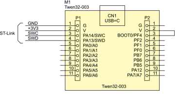 Programator-debugger jest podłączony do portów PA13 (linia SWDIO) i PA14 (linia SWCLK) mikrokontrolera. Dodatkowo port PF4 (linia BOOT0) mikrokontrolera dołączono do szyny zasilania, co wymusza wykonywanie przez mikrokontroler kodu fabrycznego bootloadera. Okazało się to konieczne, ponieważ bootloader platformy http://haohaodada.com, z którym dostarczana jest płytka TWen32F003, zmienia przy starcie konfigurację portów PA13 i PA14, odłączając je od układu SWD i blokując tym samym możliwość połączenia z programatorem-debuggerem.
