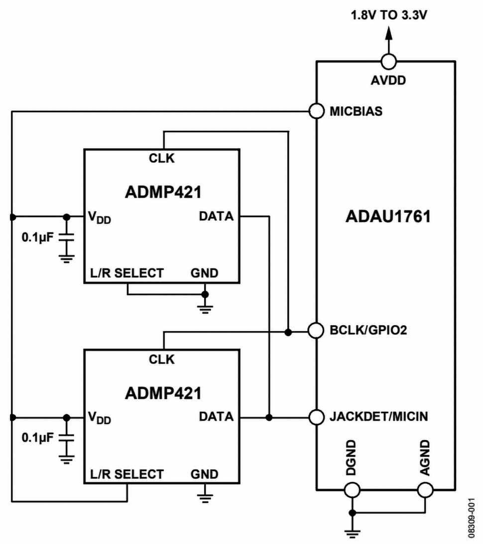 Umożliwia to podłączenie dwóch mikrofonów PDM do jednej pary linii CLK i DATA – będą one nadawać naprzemiennie, tworząc konfigurację stereofoniczną. Taką konfigurację zilustrowano na rysunku 10, gdzie dwa mikrofony dzielą wspólny zegar i linię danych, a ich podłączenie różni się tylko stanem pinów L/R, wymuszającym przyporządkowanie układu fizycznego do danego kanału.
