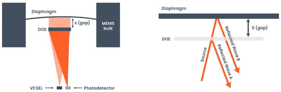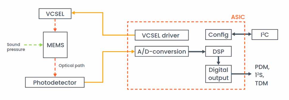 Technologia opiera się na pomiarze odbicia światła laserowego, emitowanego przez laser wnękowy typu VCSEL, od ruchomej membrany (rysunek 6). Dane, po przetworzeniu przez zintegrowany układ ASIC, są udostępniane w rozdzielczości 24 bitów przez jeden z popularnych interfejsów cyfrowych (PDM, I²S lub 8-kanałowy TDM – patrz rysunek 7).