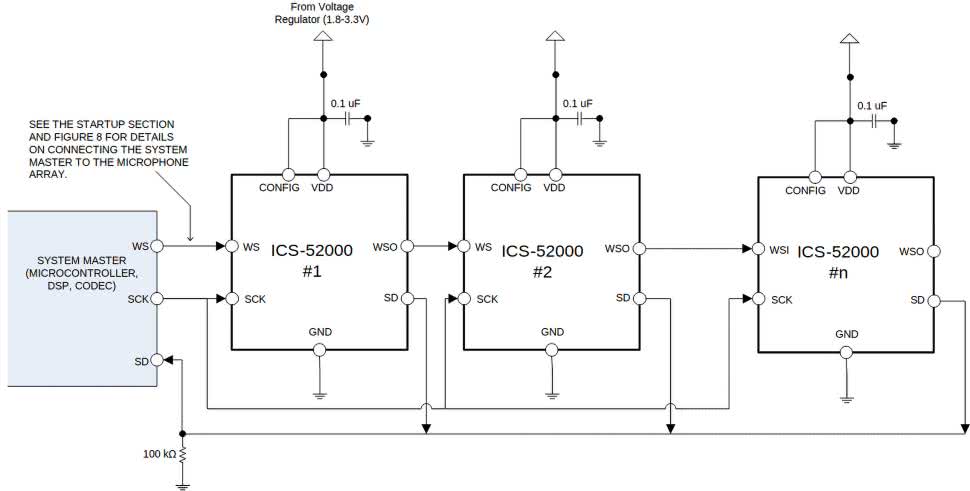 Mikrofony z interfejsem TDM transmitują swoje dane w podziale czasowym przy wspólnym zegarze, często korzystając z dodatkowych sygnałów synchronizacji ramki. Przykładem jest mikrofon InvenSense ICS-52000 – pierwszy na rynku mikrofon MEMS z interfejsem TDM obsługującym do 16 mikrofonów na jednej magistrali (rysunek 12).