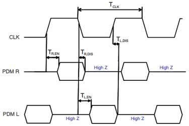 Mikrofony z wyjściem w formacie PDM nie generują własnego zegara – wymagają doprowadzenia sygnału CLK z zewnętrznego kontrolera lub procesora dźwięku. Na linii DATA mikrofon wystawia kolejne bity modulowanego sygnału, zaś linia L/R pozwala skonfigurować, przy którym zboczu zegara mikrofon wystawia swój bit (rysunek 9).