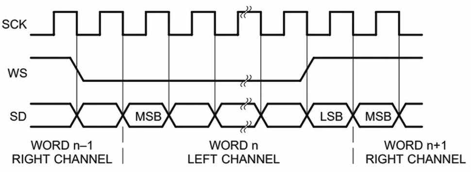 Alternatywnym rozwiązaniem, spotykanym w wielu mikrofonach MEMS, jest wbudowany interfejs I²S, przez który układ przekazuje na wyjście gotowe słowa audio (np. 24-bitowe próbki w standardowym formacie). Wyprowadzenia takiego mikrofonu to zatem typowe linie I²S: zegar bitów (BCLK), linia danych (SD) oraz sygnał ramki (WS – word select) określający kanał (rysunek 11). Zaletą I²S jest pełna zgodność z interfejsami audio większości mikrokontrolerów i procesorów sygnałowych – mikrofon obsługujący ten standard komunikacji może być bezpośrednio podłączony do linii I²S mikrokontrolera, bez potrzeby pisania oprogramowania do dekompresji PDM ani stosowania zewnętrznego kodeka. Niestety interfejs I²S, podobnie jak PDM, ogranicza do dwóch liczbę urządzeń na magistrali. Istnieją natomiast specjalizowane interfejsy do wielokanałowego przesyłu danych audio – jednym z nich jest TDM (ang. Time Division Multiplexing).