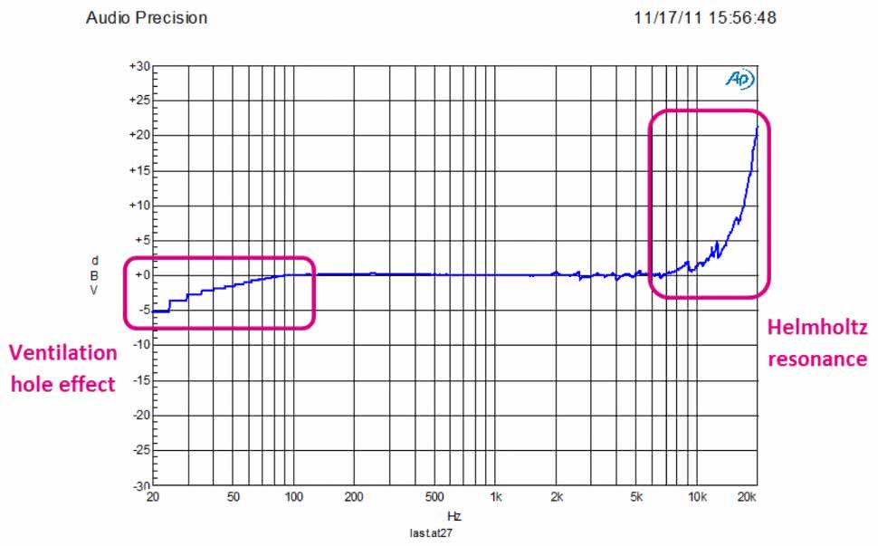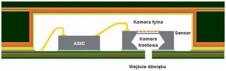 Wewnątrz obudowy wydzielone są dwie komory akustyczne: przednia, umieszczona bezpośrednio przed membraną (często jest nią przestrzeń pod pokrywką obudowy w przypadku konstrukcji top-port lub sama mikromechaniczna wnęka w strukturze MEMS w przypadku bottom-port) oraz tylna, znajdująca się po drugiej stronie membrany. Wielkość tych komór wpływa na charakterystykę częstotliwościową mikrofonu – przykładowo ograniczona objętość komory przedniej może powodować rezonans i pewne podbicie w paśmie akustycznym, co wpływa na odbiór wysokich tonów, podczas gdy wielkość i geometria komory tylnej determinują w dużej mierze przenoszenie niskich częstotliwości (rysunek 3). Projektanci mikrofonów MEMS optymalizują te parametry, dążąc do uzyskania względnie płaskiej charakterystyki w pasmie audio, przy jednoczesnym zachowaniu możliwie najmniejszych wymiarów całości.