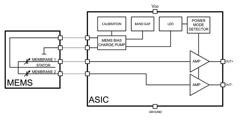 W praktycznym ujęciu mikrofon MEMS jest najczęściej układem typu dual-die, tj. zawierającym dwa główne komponenty: właściwy sensor MEMS (akustyczny przetwornik pojemnościowy) oraz współpracujący z nim układ scalony (ASIC), realizujący szereg funkcji: zasilanie i stabilizację punktu pracy struktury mikromechanicznej, wstępne kondycjonowanie sygnału oraz jego przetwarzanie (np. konwersję A/C). Obie struktury są połączone ze sobą z użyciem techniki bondingu, stosowanej we wszystkich innych układach scalonych (zarówno monolitycznych, jak i hybrydowych) i zamknięte we wspólnej obudowie z wyprowadzeniami umożliwiającymi montaż SMD. W odróżnieniu od większości typowych układów półprzewodnikowych, obudowa mikrofonu MEMS musi być wyposażona w otwór akustyczny, aby fale dźwiękowe mogły dotrzeć do membrany. Otwór ten bywa umieszczony w górnej ściance obudowy (tzw. mikrofony top-port, jak na rysunku 1, fotografia 1) albo w jej spodzie, czyli od strony PCB (konstrukcja bottom-port – rysunek 2, fotografia 2).