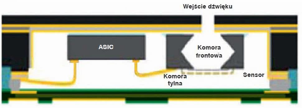 do 10...20 kHz. Typowe charakterystyki wykazują spadek czułości poniżej 100 Hz (np. –6 dB przy 50 Hz) i pewien wzrost w wyższej części pasma akustycznego, często z rezonansowym pikiem leżącym na granicy lub powyżej pasma akustycznego (wynikającym z rezonansu Helmoltza w komorze przedniej mikrofonu). - Zakres dynamiki mikrofonu to różnica między poziomem szumu własnego a maksymalnym poziomem dźwięku, jaki układ może zarejestrować. Górny limit zakresu jest wyznaczony przez osiągnięcie THD równego 10% i nosi nazwę punktu przeciążenia akustycznego (ang. AOP – Acoustic Overload Point). Nowoczesne mikrofony mają parametr AOP na poziomie 120...130 dB SPL, przy szumie własnym ok. 30 dB SPL, co daje dynamikę rzędu 90...100 dB. Model ICS-40638 marki InvenSense oferuje szczególnie wysoki AOP (138 dB SPL), co – przy poziomie szumu 31 dB – daje aż 107-decybelowy zakres dynamiki. A to nie lada osiągnięcie zważywszy na fakt, że już 130 dB SPL to poziom porównywalny z... hałasem startującego odrzutowca.