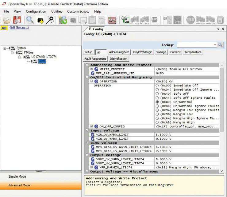 W systemie pokazanym na rysunku 2 mikrokontroler komunikuje się z LDO. Do oceny działania podsystemu zasilania można użyć LTpowerPlay – darmowego oprogramowania dostępnego na stronie analog.com. Jest to graficzny interfejs użytkownika, który komunikuje się z cyfrowym LDO za pośrednictwem interfejsu USB-PMBus.