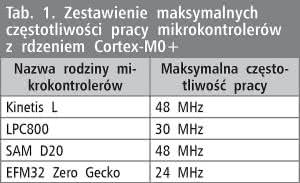 Pierwszym parametrem mikrokontrolerów z rdzeniem Cortex-M0+, który zostanie porównany, jest maksymalna częstotliwość pracy. Zestawienie porównawcze umieszczono w tabeli 1. Przedstawione wartości są stosunkowo niskie, co jednak nie jest zaskoczeniem, wziąwszy pod uwagę fakt, iż przeznaczeniem układów z rdzeniem Cortex-M0+ są raczej mało skomplikowane aplikacje, które nie wymagają wysokiej mocy obliczeniowej.