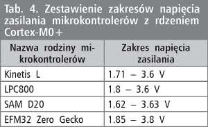 Kolejnym kryterium, według którego zostaną porównane mikrokontrolery z rdzeniem Cortex-M0+ jest zakres napięcia zasilania. Zestawienie przedstawiono w tabeli 4. Szerokość dopuszczalnego zakresu dla wszystkich układów jest podobna i wynosi ok. 1 V. Najszerszym zakresem napięcia zasilania charakteryzują się mikrokontrolery SAM D20 (2.01 V), natomiast najgorzej pod tym względem wypadają mikrokontrolery LPC800 (1.8 V). Wszystkie rodziny charakteryzują się zbliżonym minimalnym i maksymalnym dopuszczalnym poziomem napięcia zasilania. Najniższą minimalną wartością zasilania cechują się układy SAM D20 (1.62 V), a najwyższą maksymalną wartością napięcia zasilania - mikrokontrolery EFM32 Zero Gecko (3.8 V).