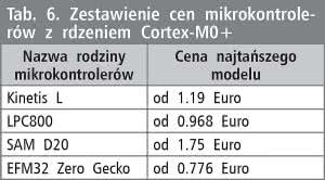 W zestawieniu porównawczym (tabela 6) posłużono się cenami tego producenta. Najkorzystniej cenowo wypadają mikrokontrolery EFM32 Zero Gecko. Jedna sztuka najtańszego w ofercie Mouser Electronics modelu EFM32ZG108F32- -QFN24 (32 kB Flash, 4 kB SRAM) kosztuje tylko 0.776 Euro. Z kolei na drugim końcu zestawienia uplasowały się mikrokontrolery SAM D20. Jedna sztuka najtańszego w portfolio Mouser Electronics modelu ATSAMD20E14 (16 kB Flash, 2 kB SRAM) kosztuje aż 1.75 Euro. Jest to wartość ponad dwukrotnie wyższa niż w przypadku modelu firmy Silicon Labs.