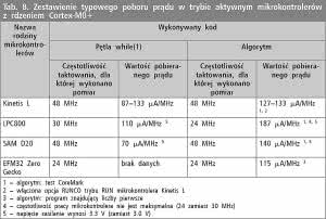 Z kolei firmy Freescale, NXP Semiconductors oraz Atmel użyły do analogicznych testów swoich układów programu będącego testem CoreMark. Z całą pewnością test CoreMark jest bardziej skomplikowany obliczeniowo niż program znajdujący liczby pierwsze, dlatego należy stwierdzić, że mikrokontrolery EFM32 Zero Gecko pobierałyby więcej prądu w przypadku wykonywania kodu testu CoreMark. Ostatnią z rzeczy, o jakiej trzeba wspomnieć, jest fakt wykonywania przez mikrokontrolery Kinetis L kodu testu CoreMark w trybie RUN z opcją RUNCO, która ogranicza funkcjonalność mikrokontrolera przez zablokowanie sygnałów zegarowych peryferiów. Oznacza to, że w przypadku wykonywania kodu testu Core-Mark mikrokontroler Kinetis L w trybie RUN bez opcji RUNCO pobierałby nieco więcej prądu.