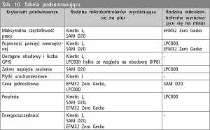 W ramach podsumowania warto wskazać które rodziny mikrokontrolerów zaprezentowały się najlepiej i najgorzej w kontekście każdego z kryteriów. Zestawienie porównawcze przedstawiono w tabeli 10.