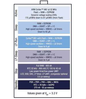 Na rysunku 1 pokazano deklarowane przez producenta pobory mocy przez CPU w różnych trybach pracy, których mnogość jest jednym z elementów pozwalających zminimalizować pobór prądu przez mikrokontroler.