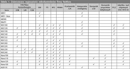 Mikrokontrolery NuMicro to układy energooszczędne pracujące z zegarem do 72 MHz, w szerokim zakresie napięcia zasilania. Prędkość przetwarzania wynosi 0,9 DMIPS/ MHz. Wyposażone w liczne peryferia i szybkie interfejsy komunikacyjne, charakteryzują się doskonałą funkcjonalnością i mają wiele interfejsów służących do połączenia ze światem zewnętrznym. Programowanie odbywa się w oparciu o zestaw instrukcji Thumb 2 zawierający 56 rozkazów. Portfolio mikrokontrolerów firmy Nuvoton przedstawia rysunek 1.