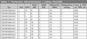 Układy PSoC40xx pozbawione są także najbardziej charakterystycznej cechy procesorów Cypress'a, czyli uniwersalnych, programowalnych bloków logicznych UDB. Do dyspozycji użytkownika pozostawiono tylko programowalny blok PWM. Oczywiście, mikrokontrolery mają obsługę klawiatur dotykowych CSD. W zależności od typu procesora zmieniają się wielkość pamięci, liczba linii GPIO i związana z nimi wielkość obudowy. Bez zmiany pozostaje zakres napięć zasilania 1,71...5,5 V. Mikrokontrolery są oferowane o obudowach SO8, SO16, QFN16, QFN24. Dokładne porównanie wyposażenia umieszczono w tabeli 1.