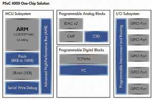 Strukturę wewnętrzną układów rodziny PSoC4000 pokazano na rysunku 1. Wyraźnie widać, że głównym celem przy opracowaniu procesorów była minimalizacja kosztów. Rdzeń jest taktowany niższą częstotliwością (16 MHz), zostały ograniczone pamięci programu i danych, układy pozbawione są przetworników A/C. Z peryferiów analogowych pozostawiono tylko komparator analogowy oraz prądowy przetwornik C/A. Procesor okrojono także z programowalnych bloków do komunikacji szeregowej SCB, których funkcjonalność ograniczono do obsługi magistrali I²C.