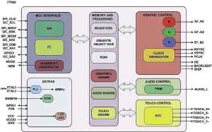 Dzięki temu możliwe jest użycie niedrogiego, energooszczędnego mikrokontrolera, który za pomocą interfejsu SPI lub I2C, poprzez układ FT800, wysteruje wyświetlacz, obsłuży panel dotykowy z wielodotykiem, a nawet odtworzy dźwięk na głośnikach. Kompletny schemat blokowy układu FT800 został przedstawiony na fotografii 1.